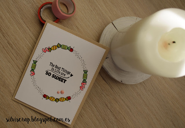 A parte, he estampado sobre cartulina Neenah Solar White con tinta negra Memento 4 magdalenas que he pintado con los Copic. Las he recortado y las he pegado con foam para darles volumen. El sentimiento lo he estampado en cartulina blanca que he pegado debajo las magdalenas. Y ya está, tarjeta terminada!